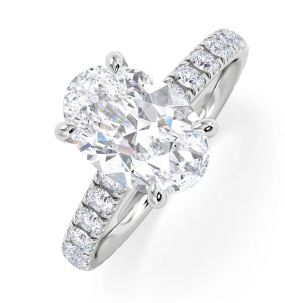 Discover our hidden halo engagement ring with a diamond shank, featuring a 3.00ct premium quality G/VS1 oval cut diamond main stone, set in the finest platinum. From above, this design appears to be a solitaire oval cut engagement ring with...