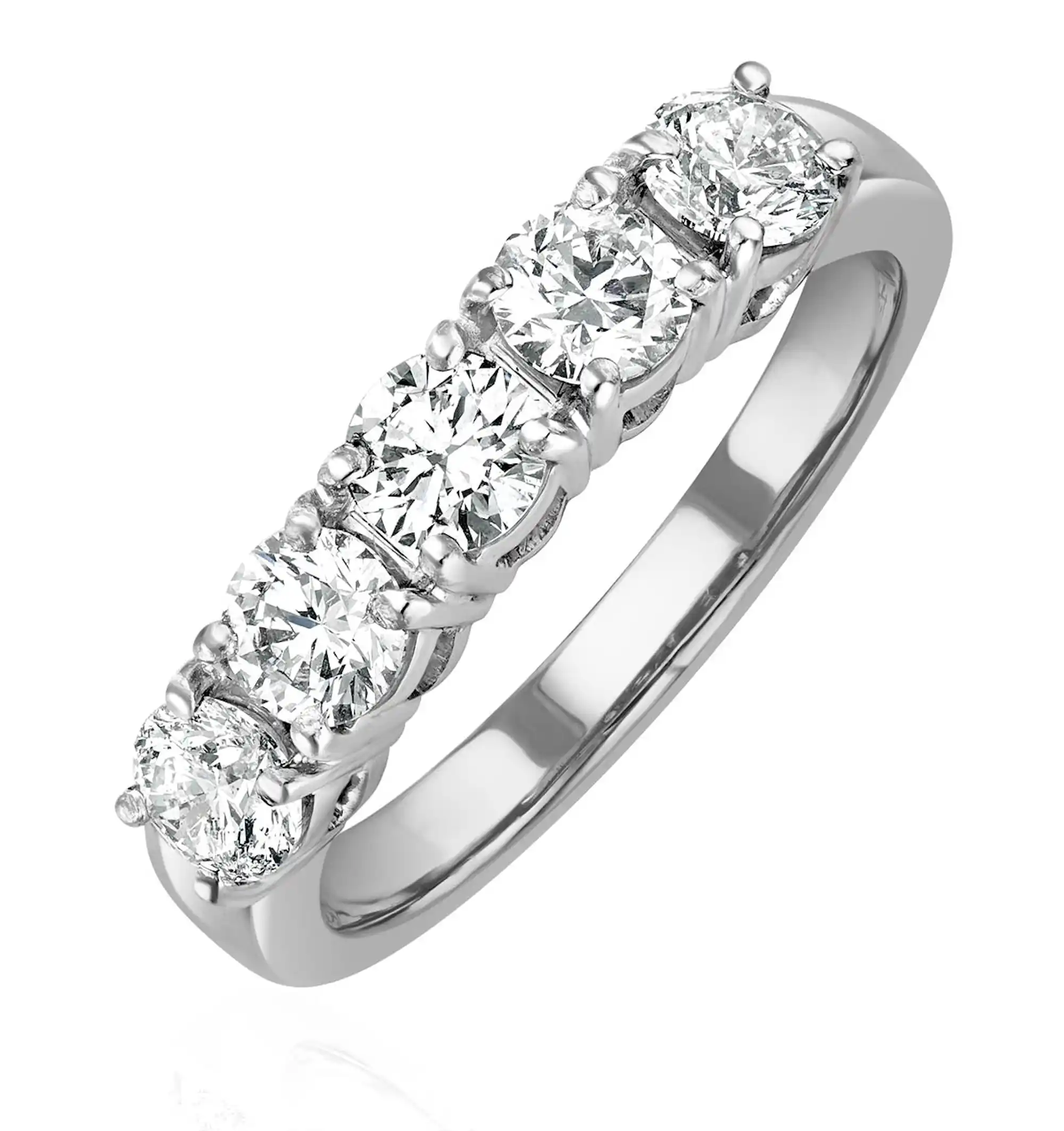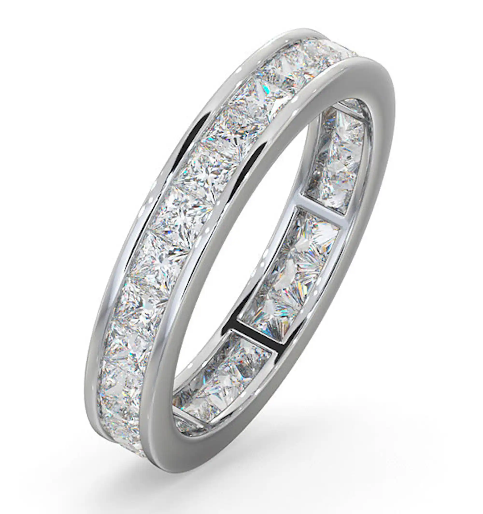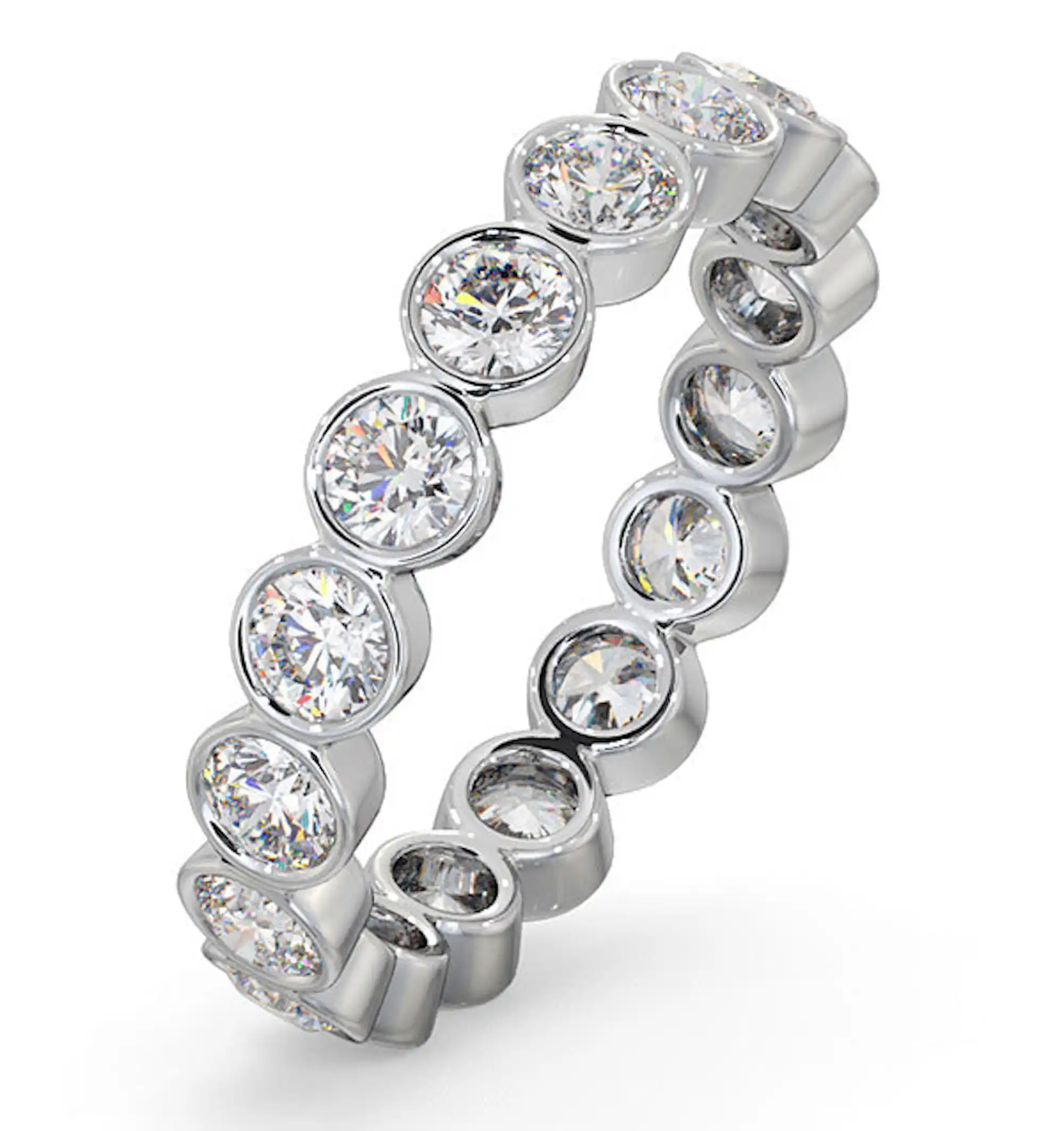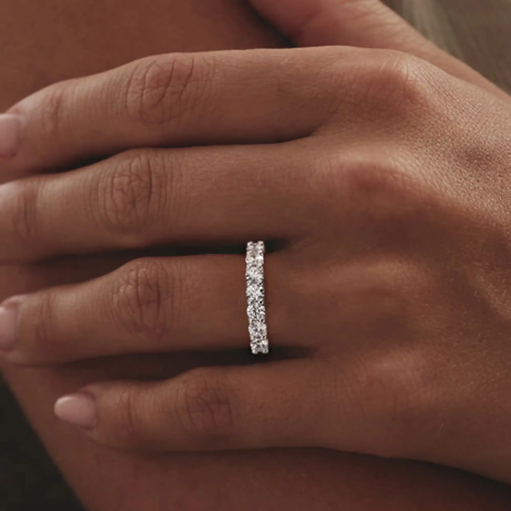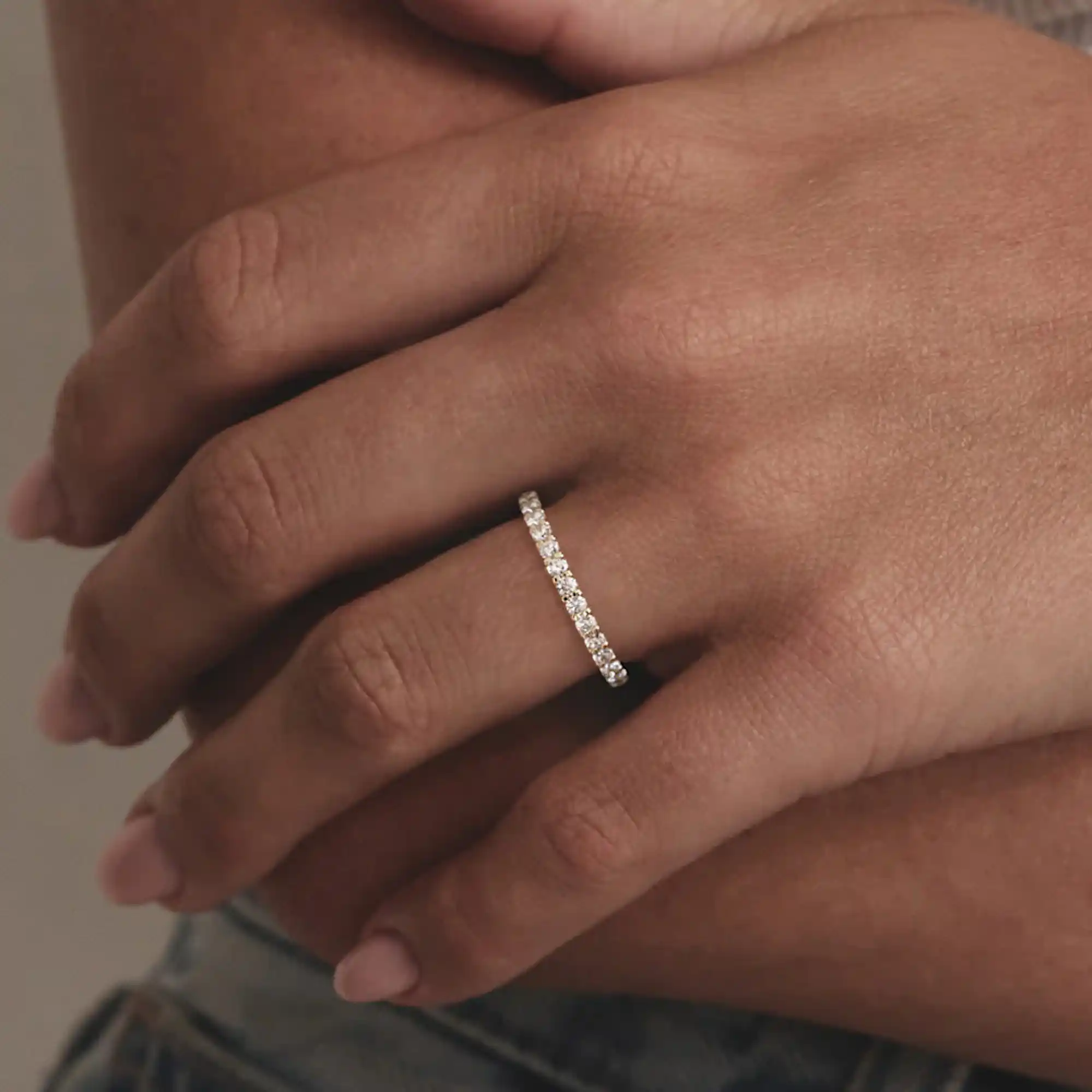 A full eternity ring features diamonds or gemstones set all the way around the band, creating continuous sparkle from every angle. A half eternity ring has stones set across the front half of the band only, leaving the back smooth for added comfort and easier resizing. Both styles symbolise everlasting love, with the choice often coming down to personal preference and lifestyle.