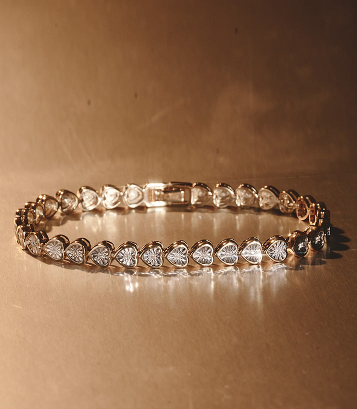 Discover our elegant Diamond Heart Bracelet, featuring 0.02ct diamonds set in the finest gold vermeil. The pavé diamond hearts wrap around the wrist, giving the illusion of never-ending stones, and sparkling with every movement. The bright white stones stand out...