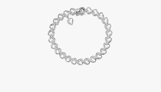 Discover our Diamond Silver Heart Bracelet, with 0.02ct of sparkling round diamonds in a pavé setting, in the finest silver. The never-ending illusion of hearts sit delicately on the wrist, and sparkles with every movement. The bracelet is secured with...